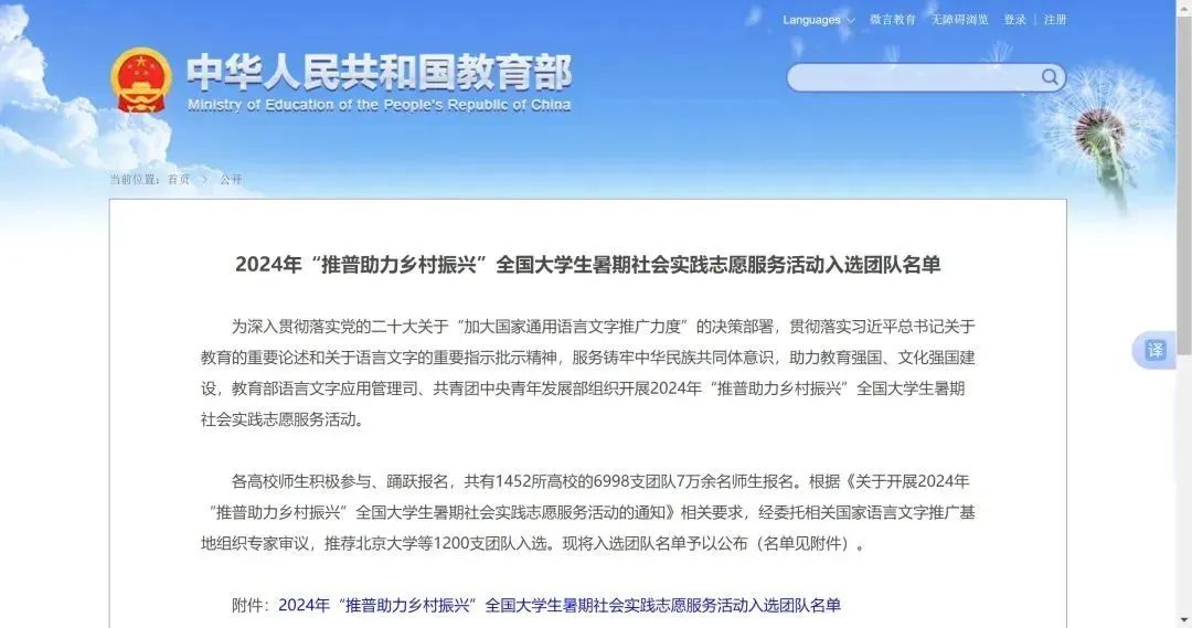 2024年6月,教育部正式公布《2024年“推普助力乡村振兴”全国大学生暑期社会实践志愿服务活动入选团队名单》,该名单汇聚了来自全国各地近5000支高校实践团队的精英,经过严格筛选,共有1200支团队脱颖而出。在这份光荣榜上,学校以其卓越的表现,有两支团队荣幸地跻身其中。
