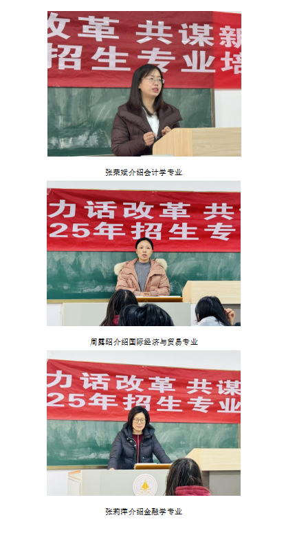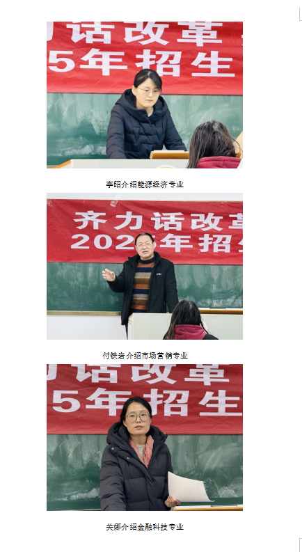 培训伊始,侯磊介绍了学校2025年本科招生宣传工作的安排和部署,希望更多生源高中考取威尼斯官网的学子积极参与到招生工作中。对已经考取的学子作为校友对学校有着深厚的情感,他们的参与可以加强校友之间的联系,增强校友的凝聚力和归属感。经济与管理学院的张荣斌、关娜、李昭、张莉萍、周露昭、付铁岩和张嘉婧7位老师依次详细地介绍了各专业的基本情况和办学特色,向学生们充分展示了学院在办学条件和人才培养方面的优势,并耐心解答现场学生的提问。