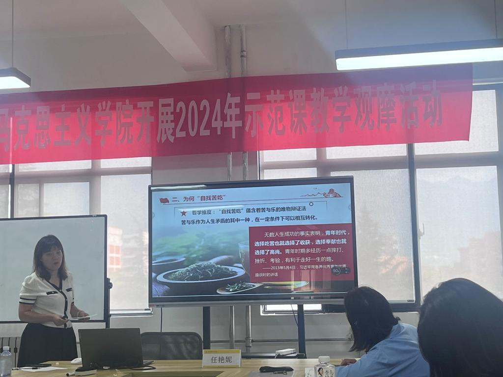 此次示范课由胡景莲和白雪妮两位老师担任主讲。胡景莲老师以“青年人为何要自找苦吃”为主题进行教学展示。白雪妮老师以《思想道德与法治》课中“公民如何依法行使权利”内容进行教学展示。