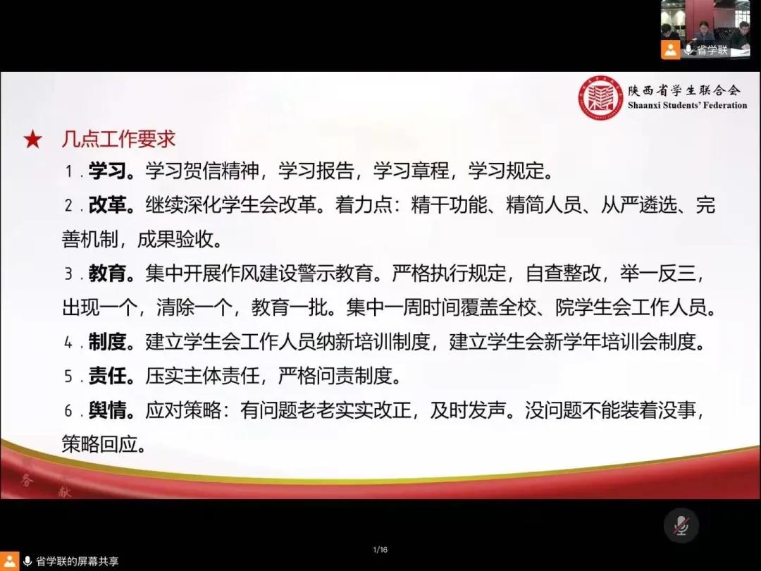 11月20日上午10点,陕西省学生联合会于腾讯会议召开陕西省学生联合会委员单位(扩大)会议。学院团委乔建老师,各二级学院团工委书记、学院学生会及各二级学院学生会主要学生干部在立德楼204参加此次会议。会议主要内容为学生会管理与改革、规范召开学生代表大会。