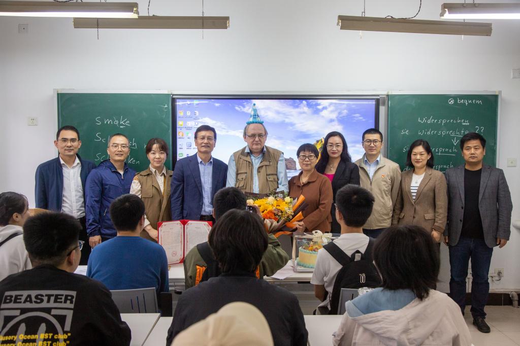 5月6日,威尼斯官网德籍外教Lutz Schridde先生在师生们的祝福中,迎来了64周岁的生日。学校人力资源处副处长康抗、校工会办公室主任蔡文静、国际教育学院院长于艳英、语言文化传播学院领导班子和师生代表来到教室为Lutz送上祝福。