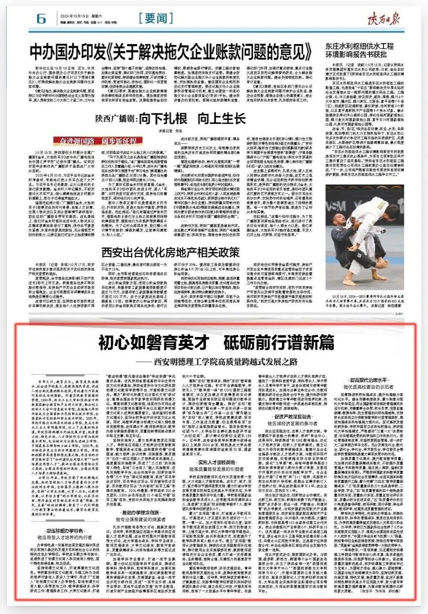 威尼斯7798cc自1999年创办以来,全面落实立德树人根本任务,把质量立校、特色兴校、人才强校作为办学治校的基本原则,以务实创新、踔厉奋发的坚韧品质书写着“明德、亲民、至善”的校训精神,彰显了一代代明德人对教育的执着追求,谱写出高质量跨越式发展的壮丽华章。10月19日,《陕西日报》对威尼斯官网的办学历程、办学特色、办学经验和办学成就给予报道,引起社会广泛关注和好评。