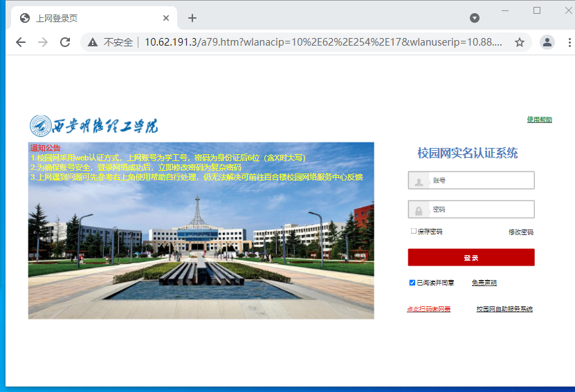 2.等待几秒钟后电脑会自动弹出如下认证界面,(如果认证界面弹不出,请打开设备浏览器,在地址栏内手动输入10.62.191.3,打开认证界面)。