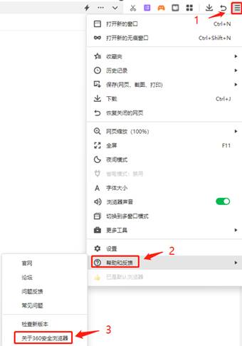 1.请使用360浏览器(极速浏览器、安全浏览器、企业安全浏览器)极速模式(版本低于13,内核低于107版)。若已安装高版本360浏览器,建议卸载后重新安装可用版本。360浏览器13版本安装程序及操作见附件1。360安全浏览器查看内核版本方法如下图所示。